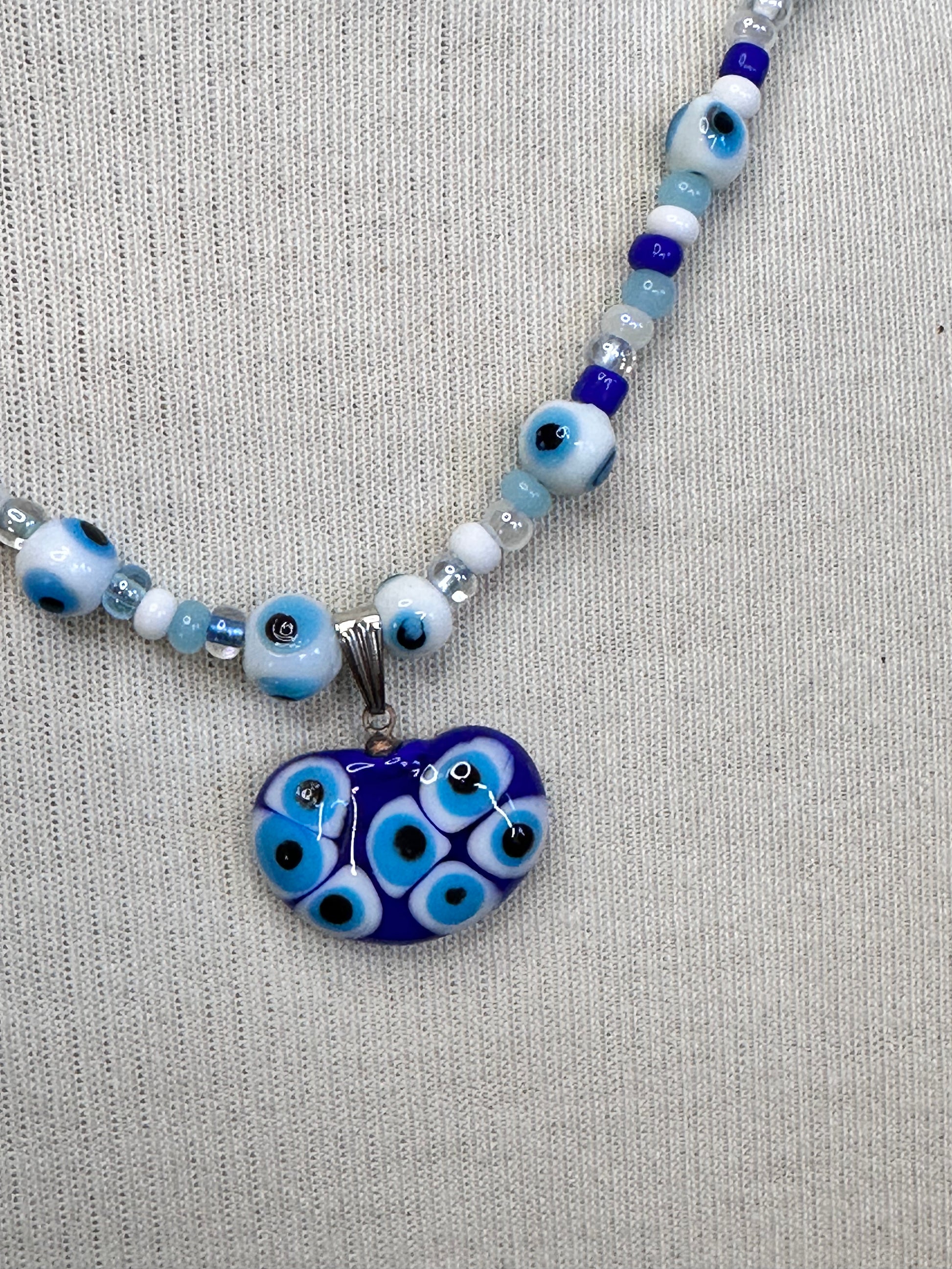 Murano style lampwork glass pendant with Evil Eye strung with various colors of large seed beads and white Evil Eye beads