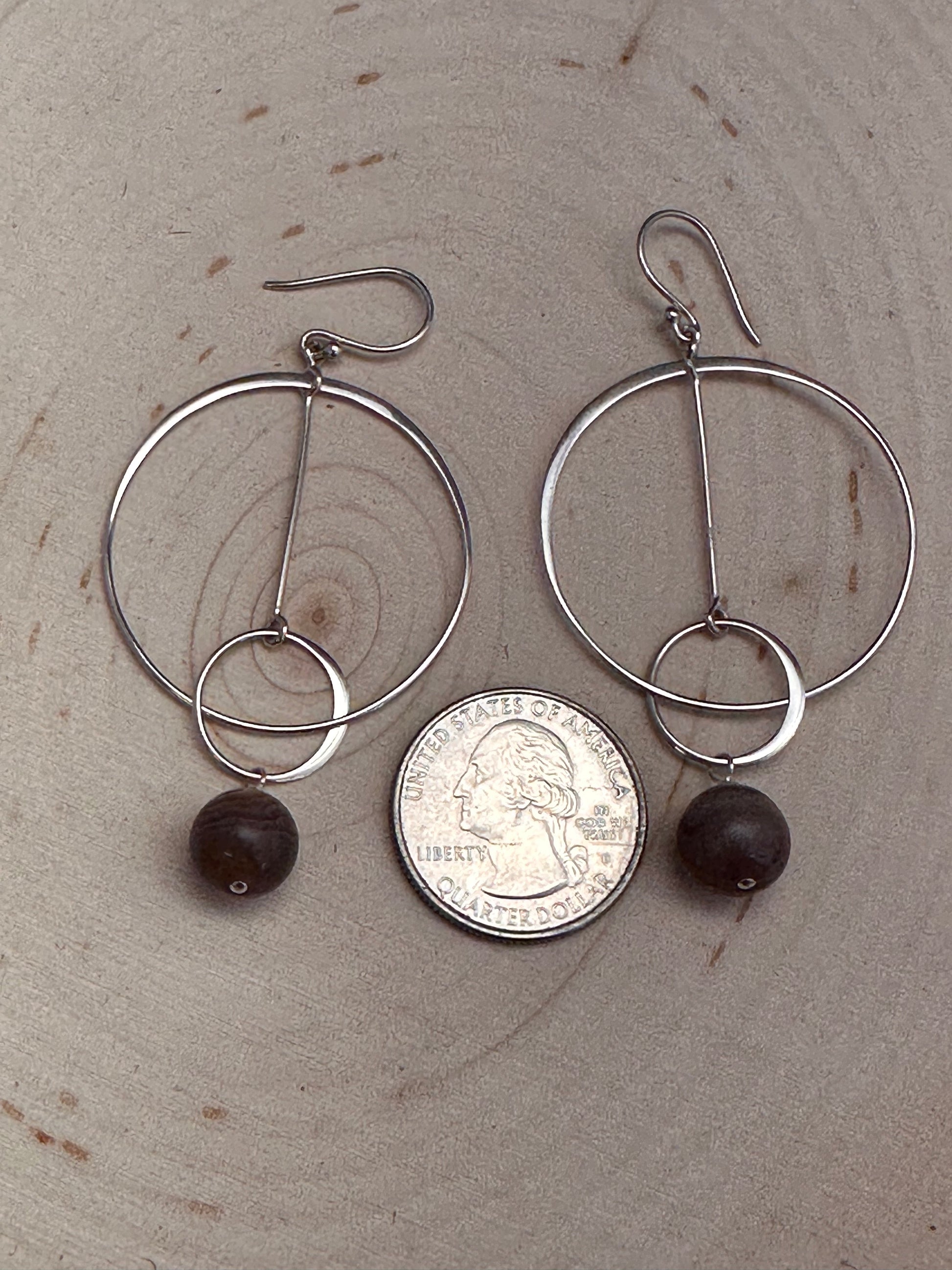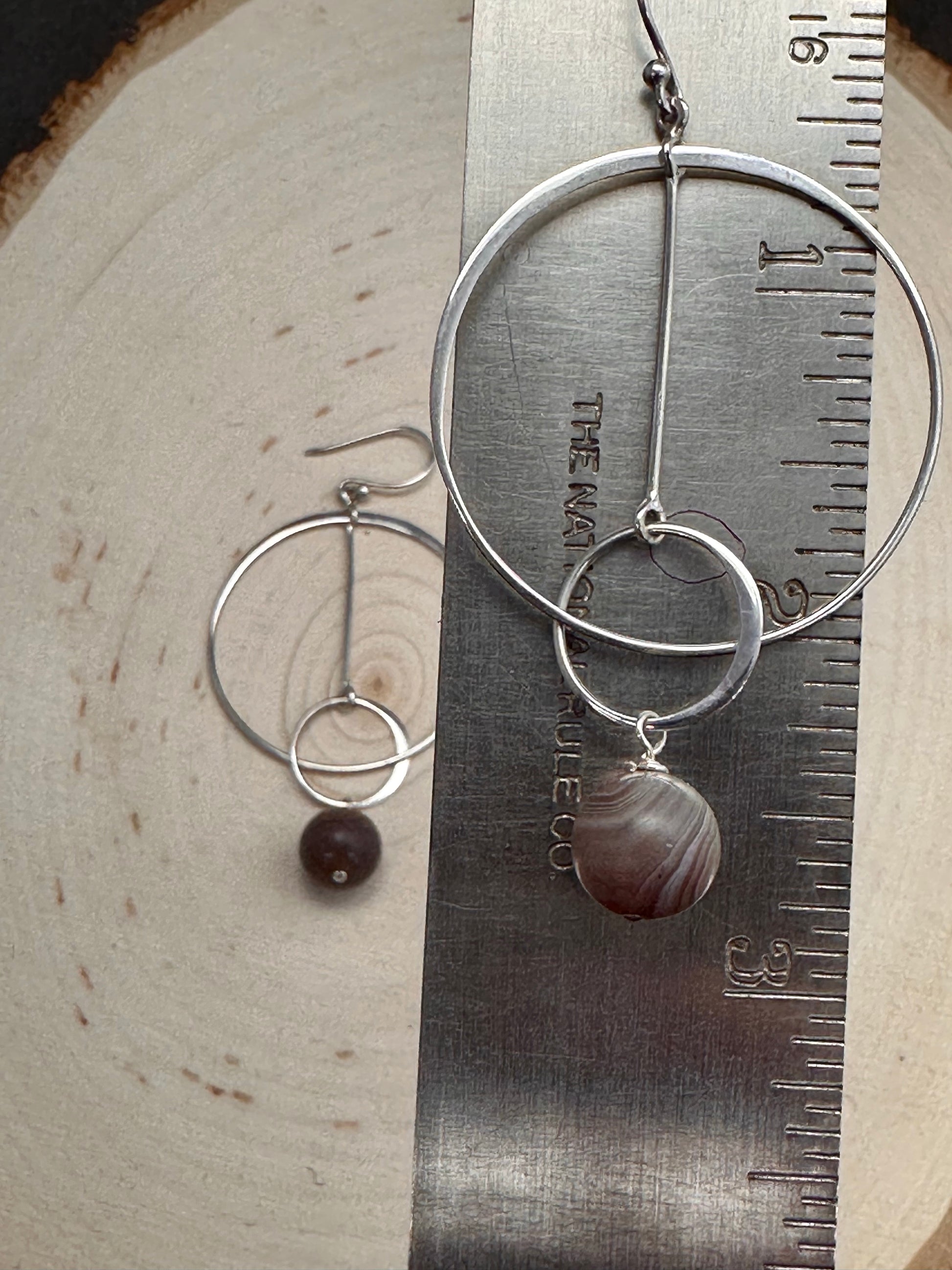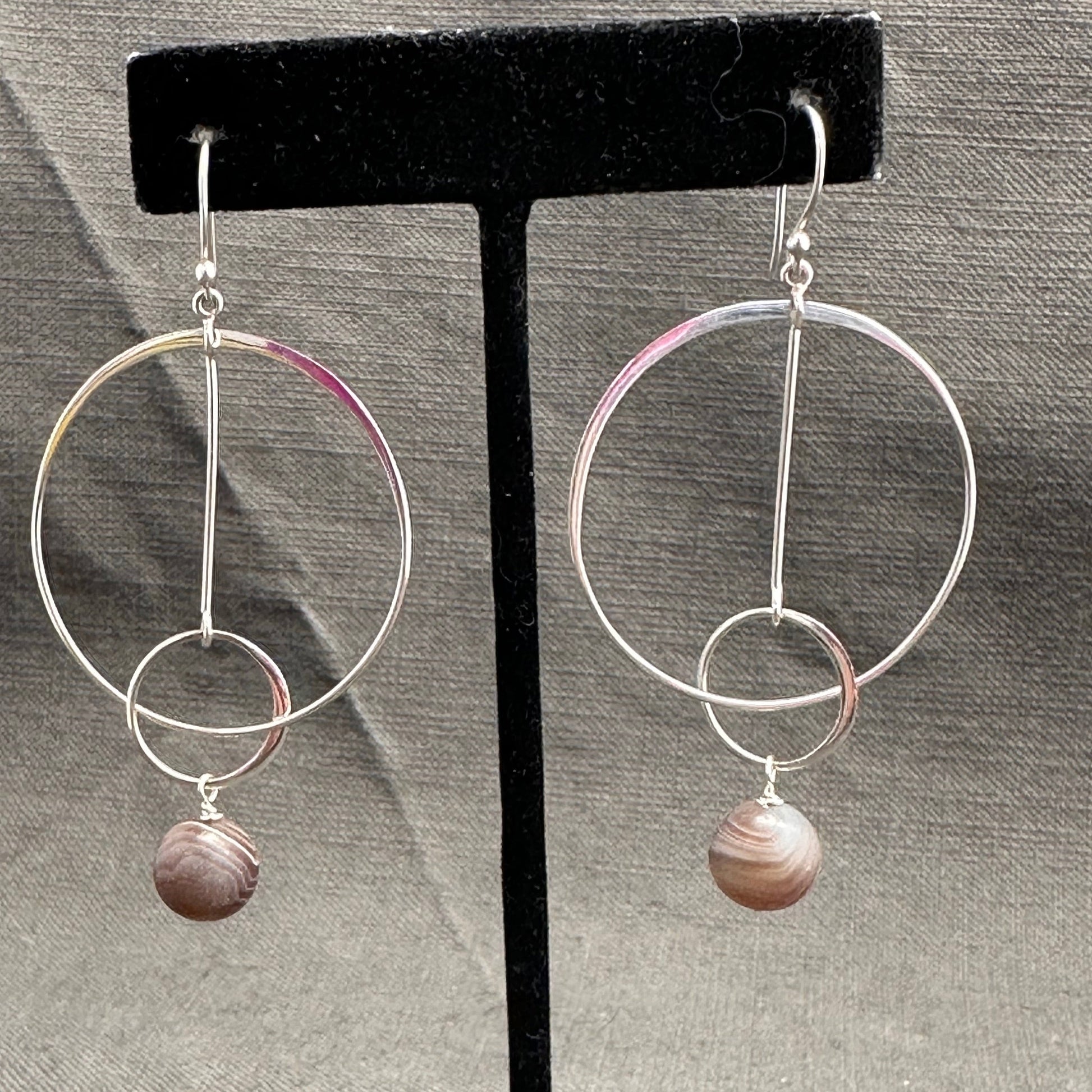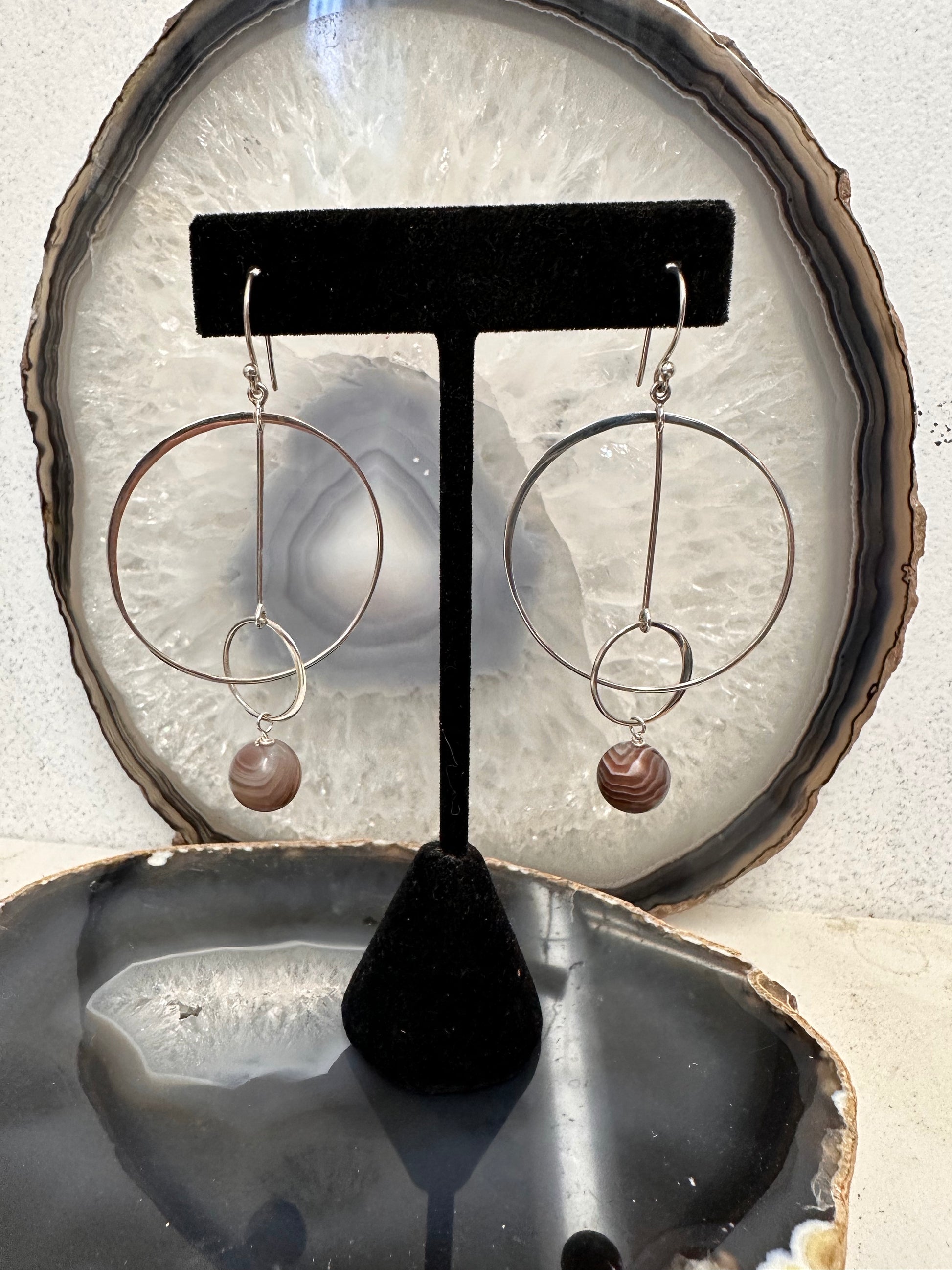 Botswana Agate rounds wire wrapped in sterling to two sterling circles bisected; hanging from sterling hooks