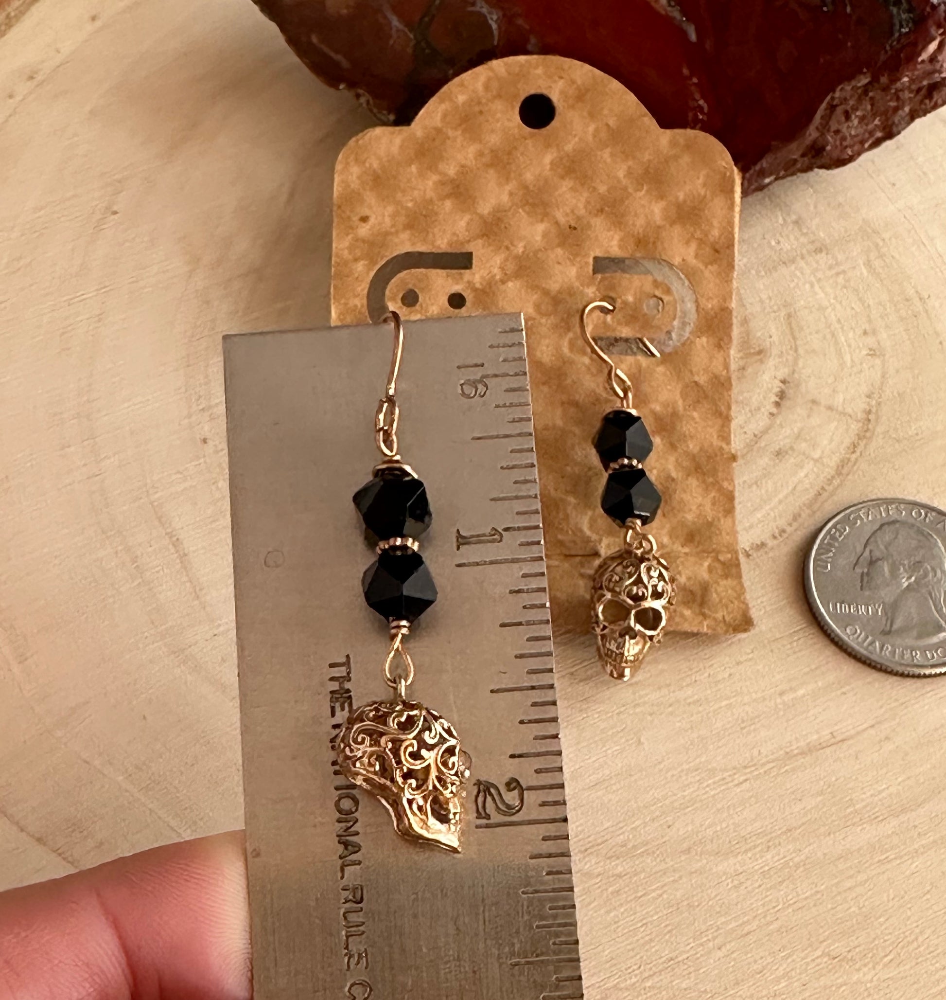 Bronze filigree skull charms wrapped in bronze wire to onyx and bronze beads; bronze hooks