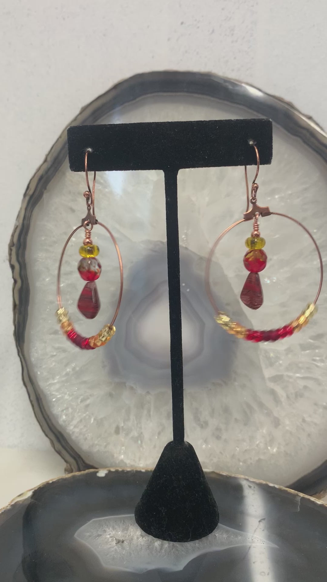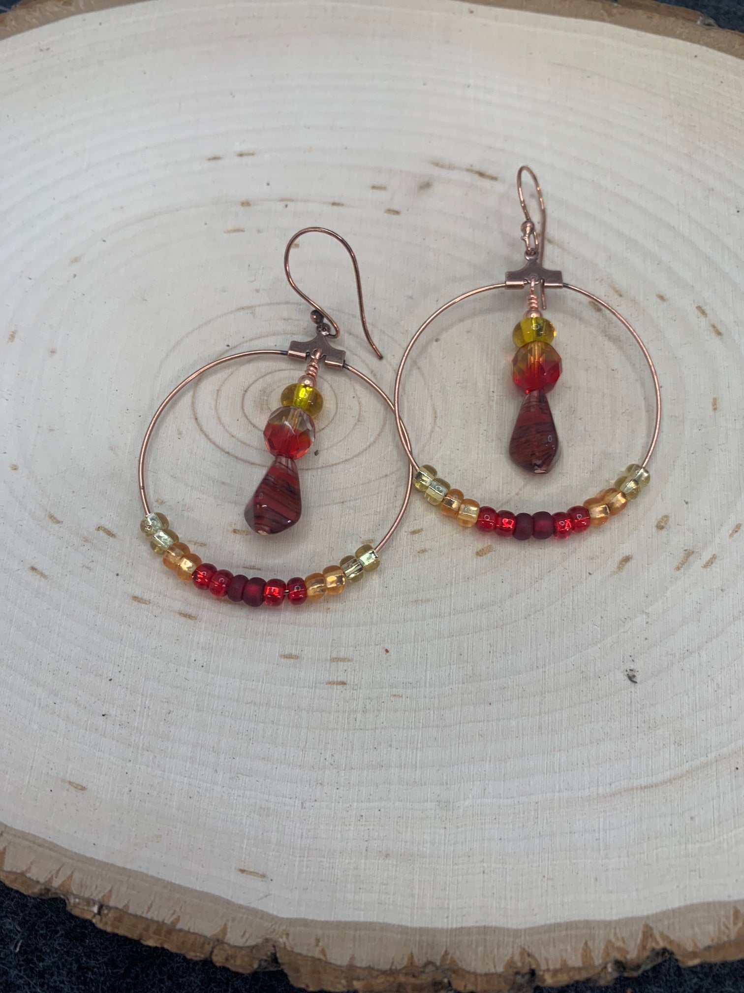 Copper hoops with glass seed beads and three glass beads in the center on a copper pin hanging on copper hooks