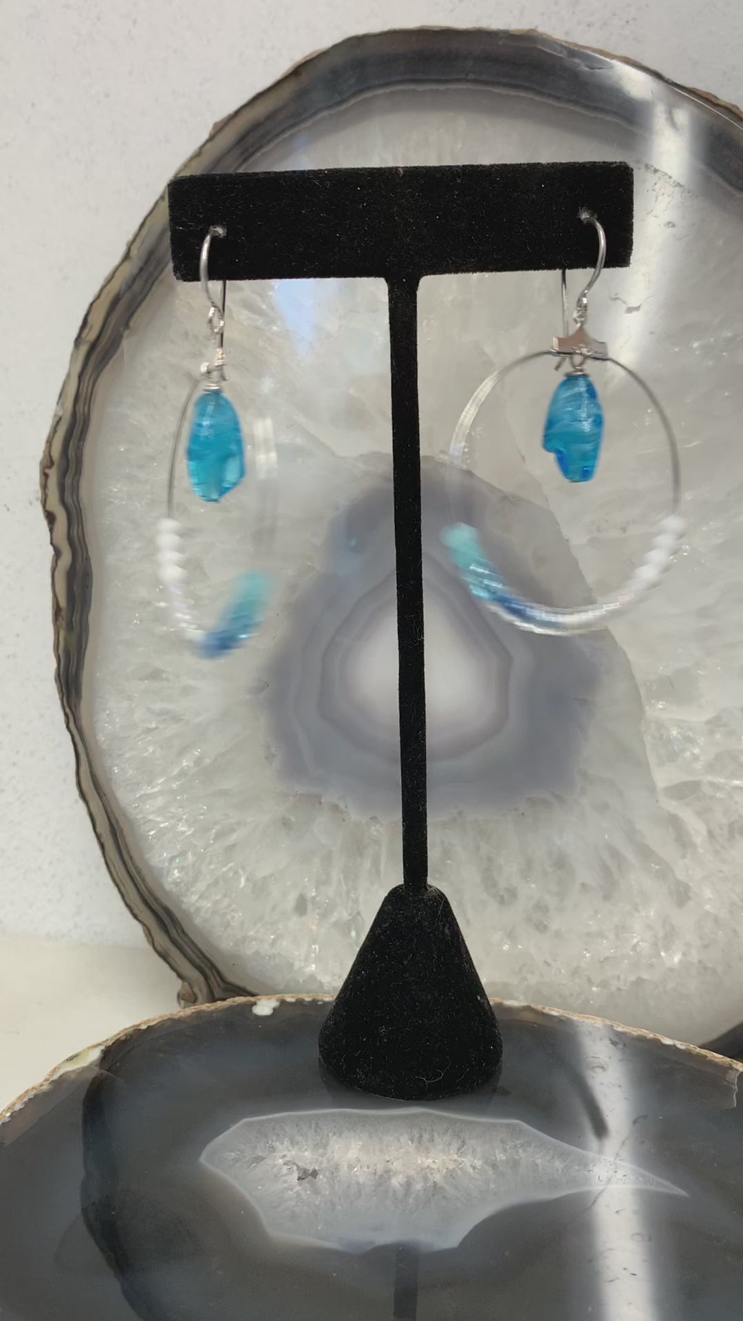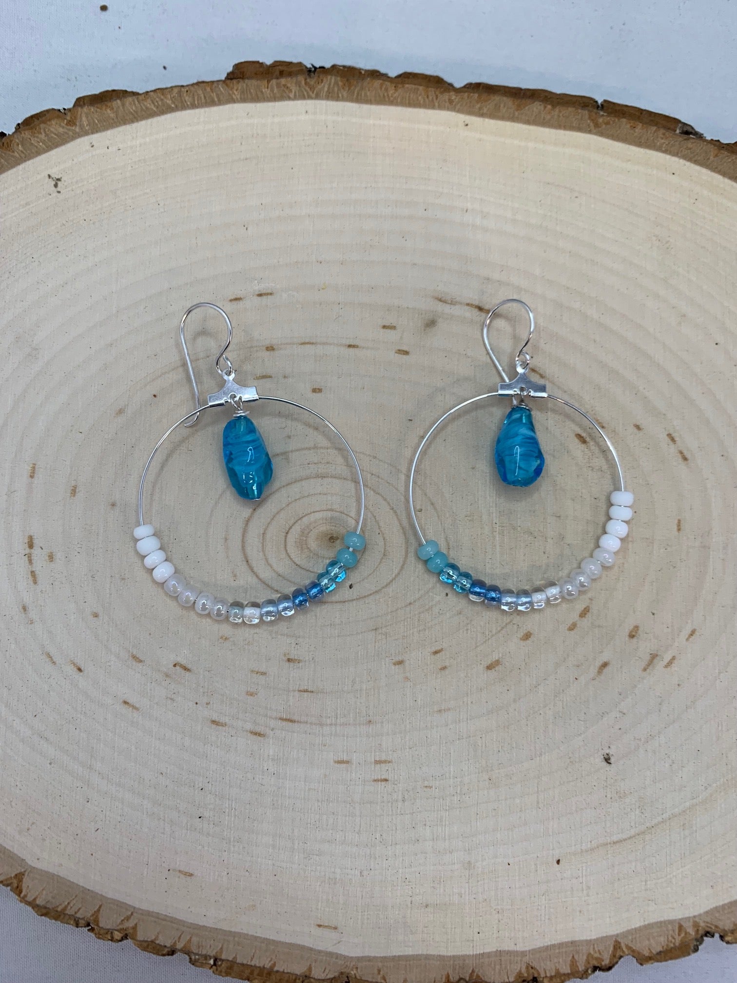 White metal hoops with seed beads and blue glass bead focal on sterling hooks