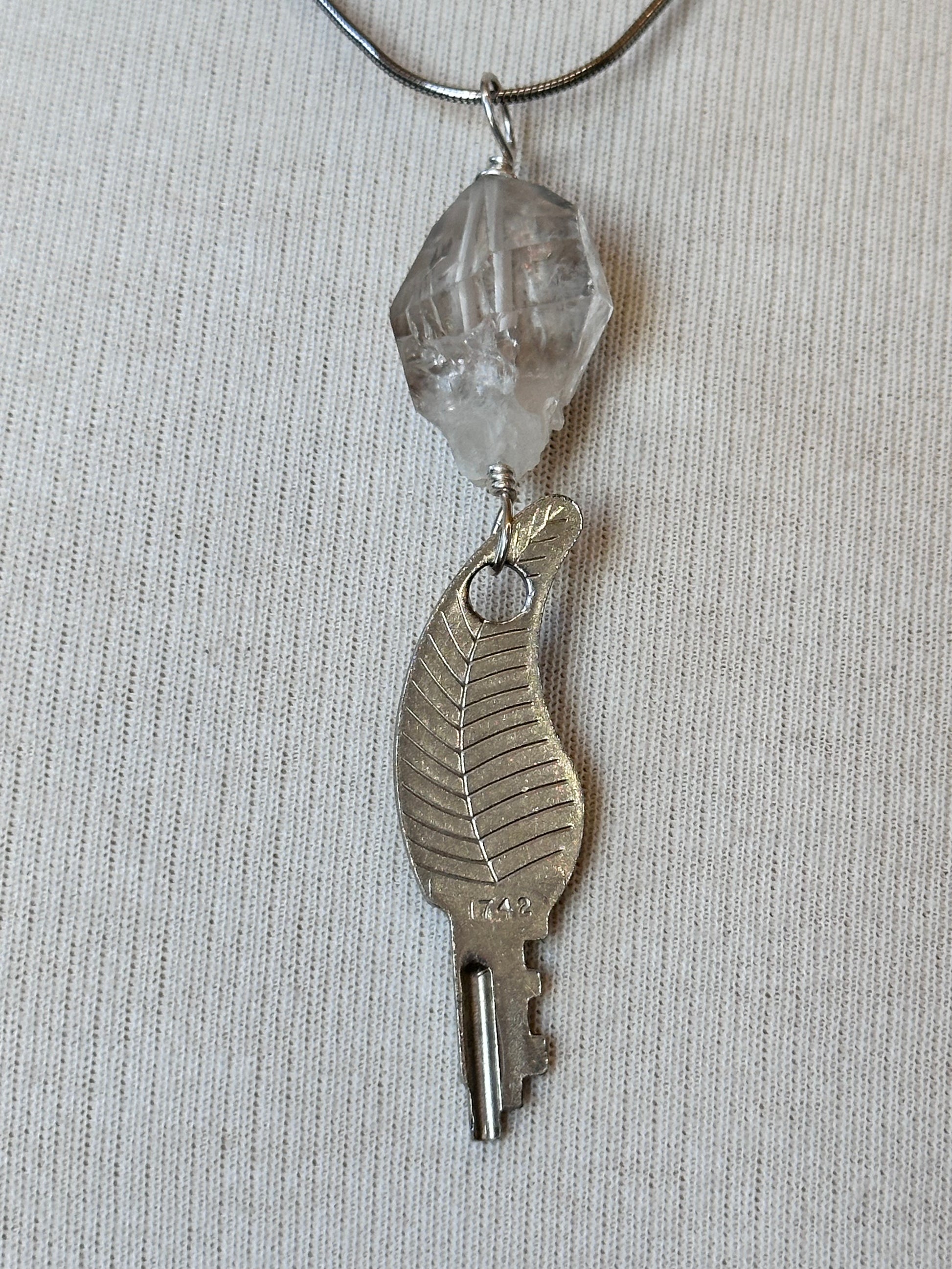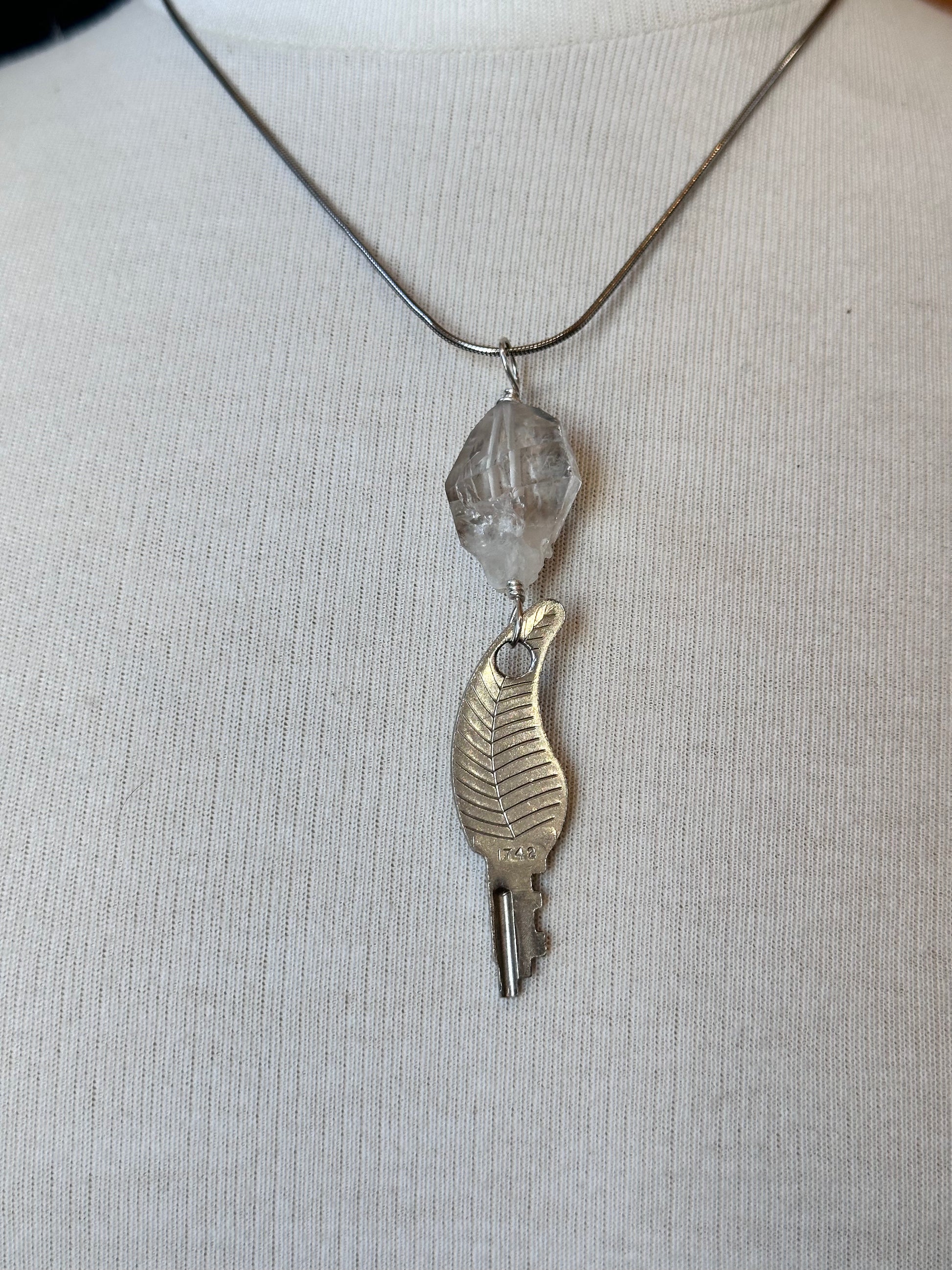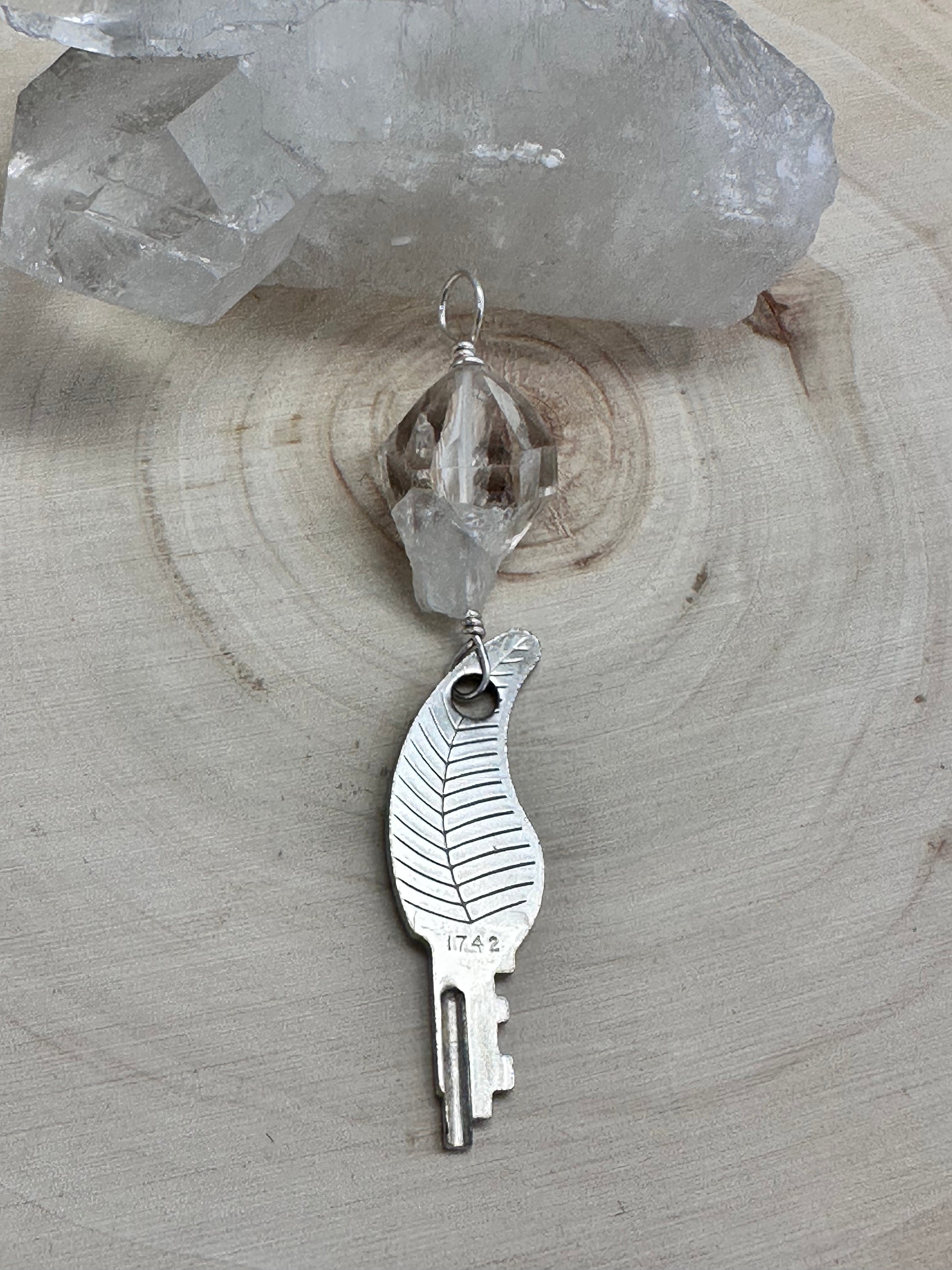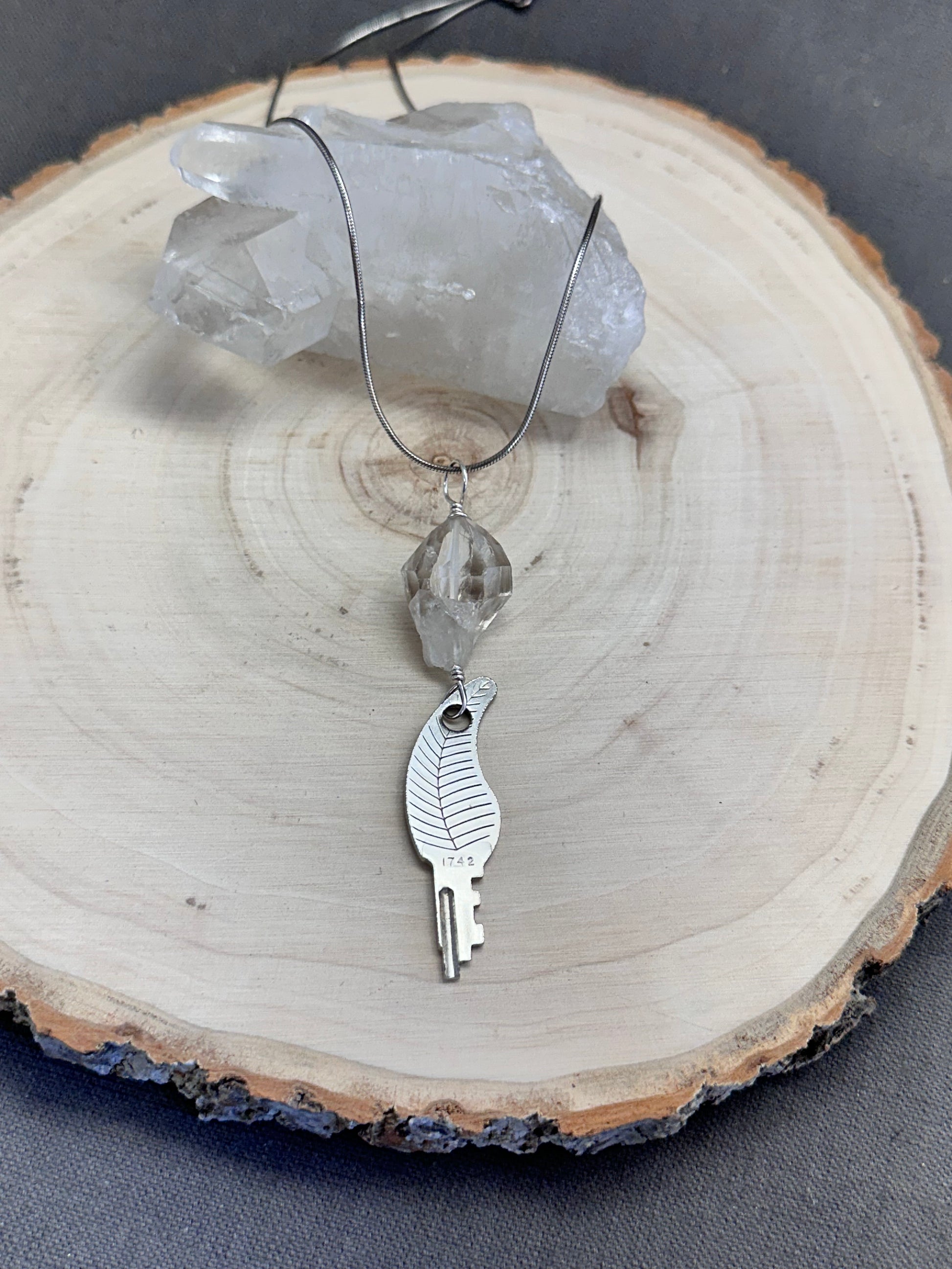 Key to Justice - feather key wrapped in sterling wire to center drilled scepter quartz. 18 inch chain included