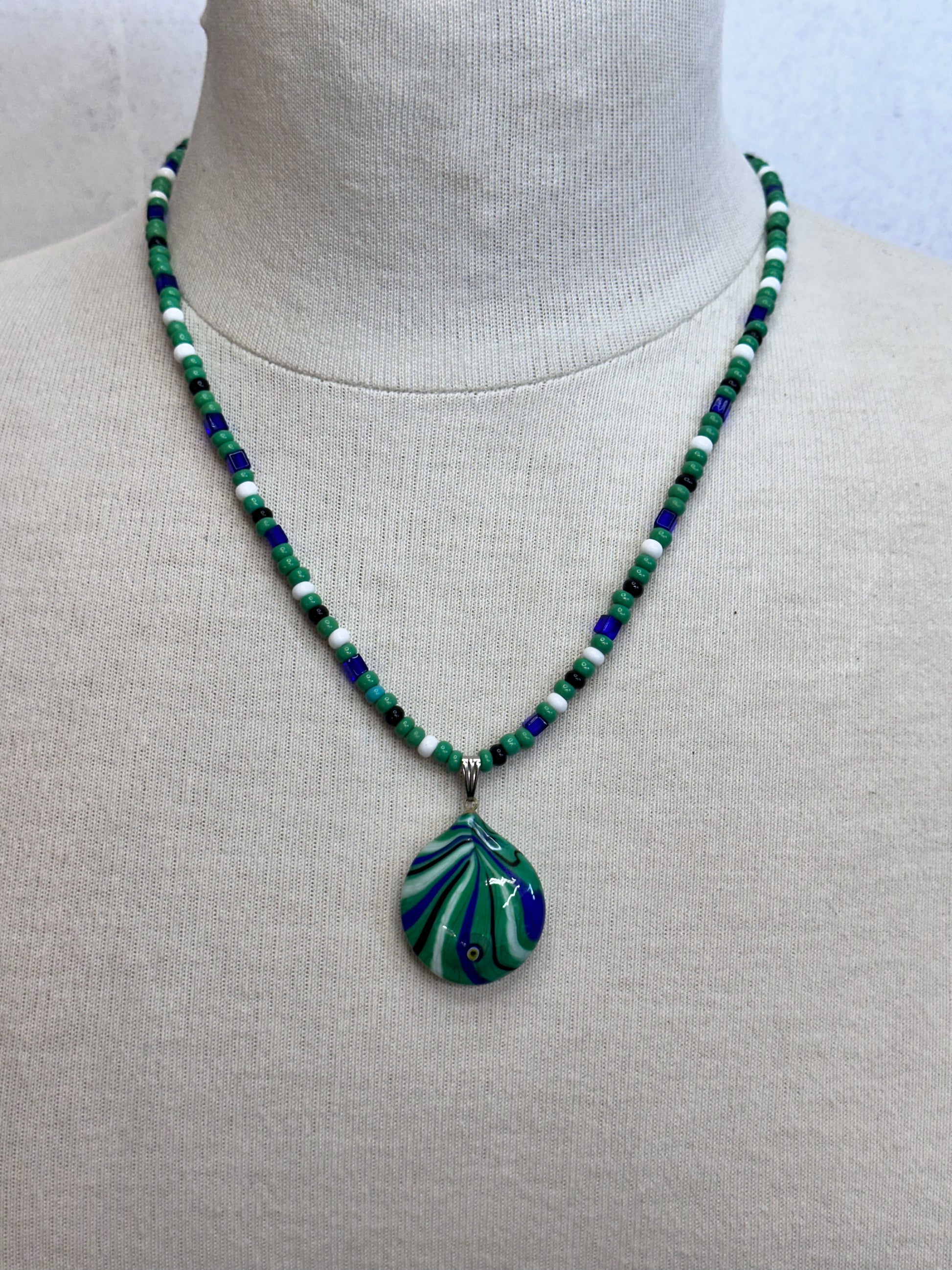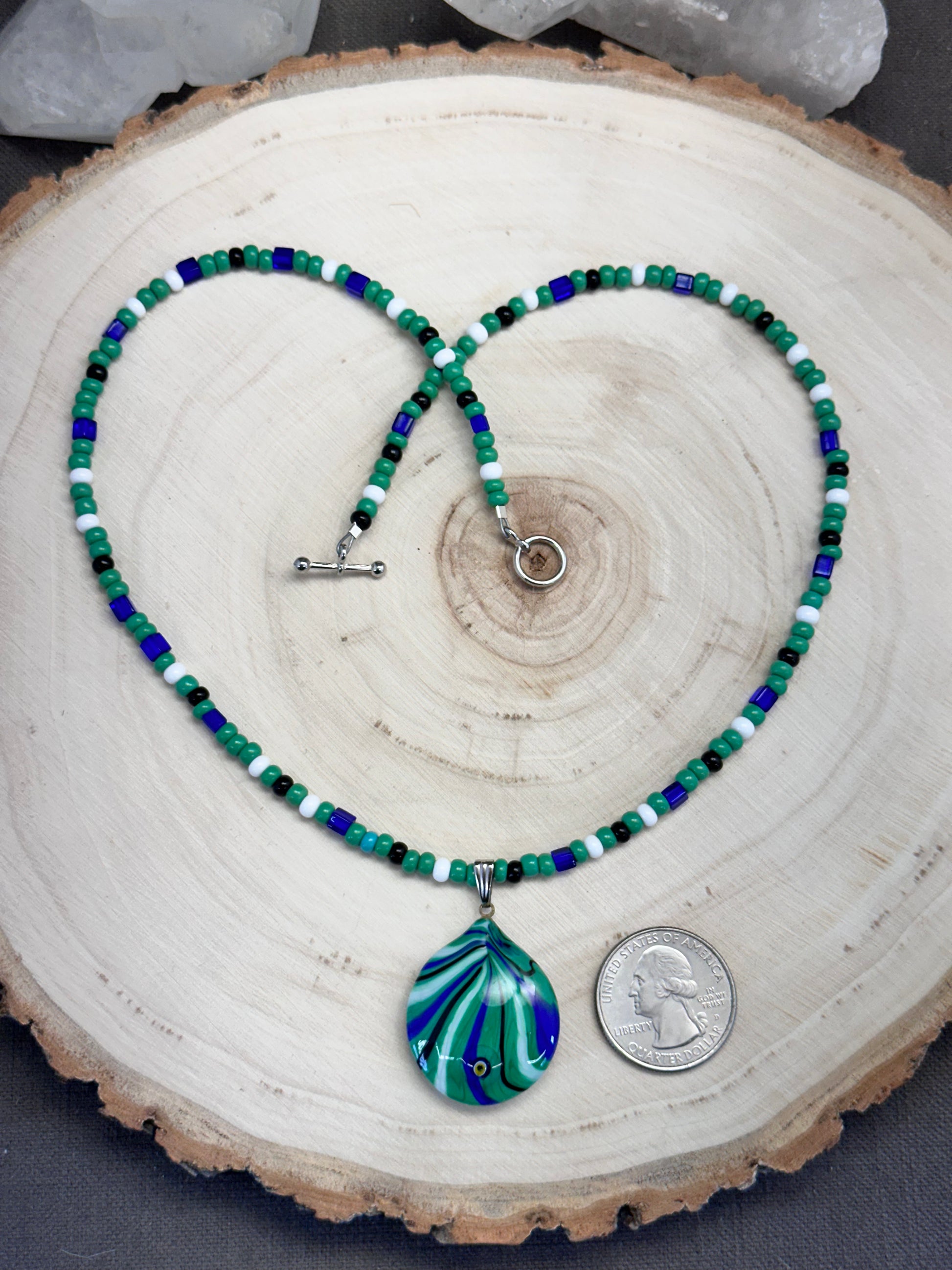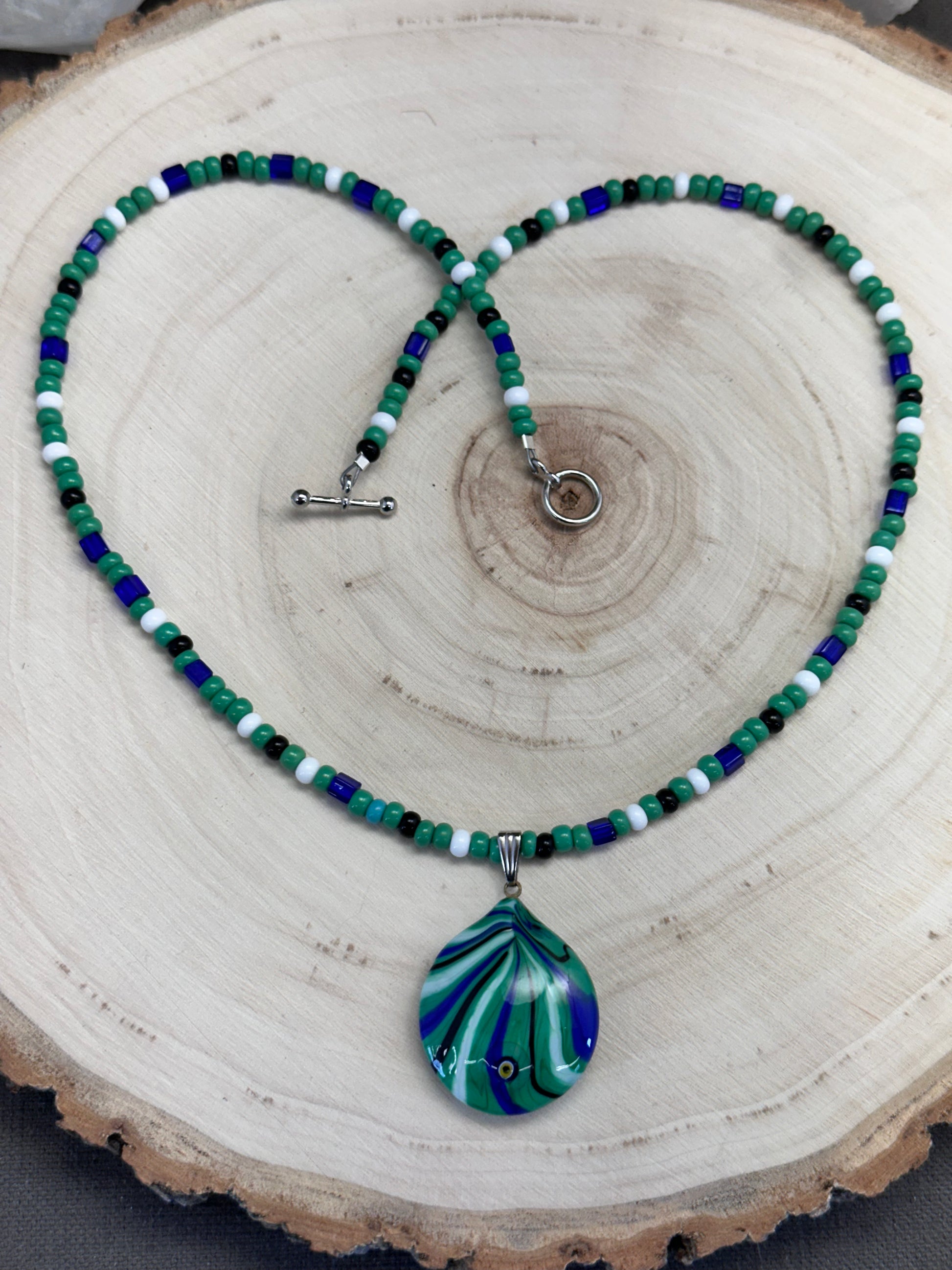 Murano style lamp-work glass pendant with Evil Eye strung with various colors of large seed beads, white metal toggle
