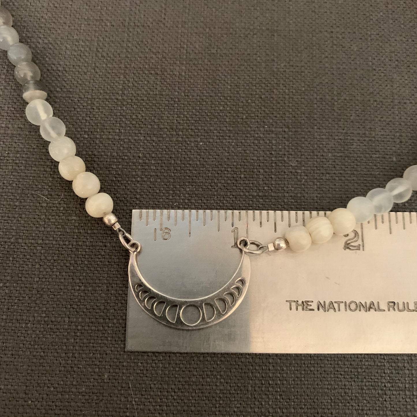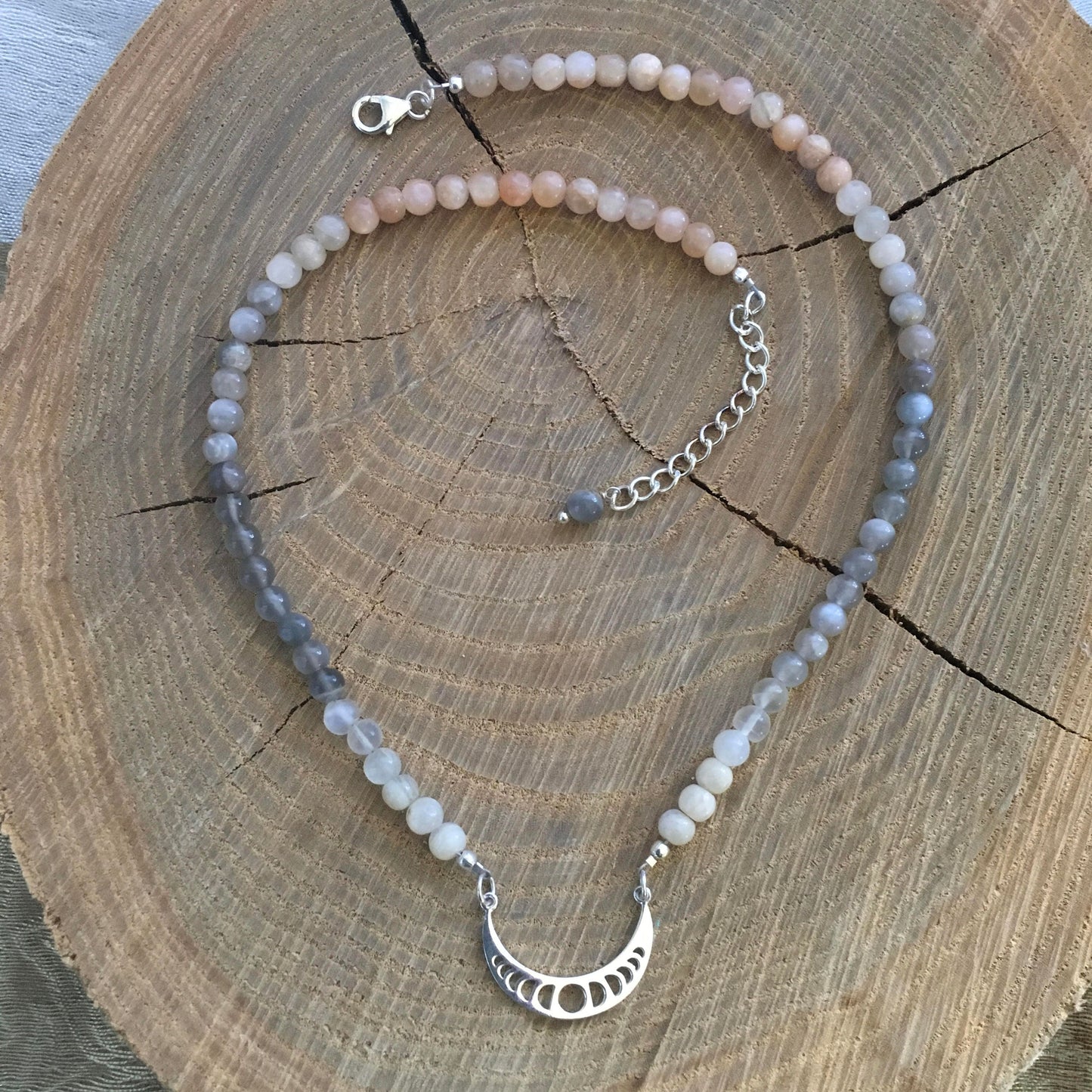 Lunar Cycles - moon phase pendant strung with variegated moonstone rounds; sterling findings.