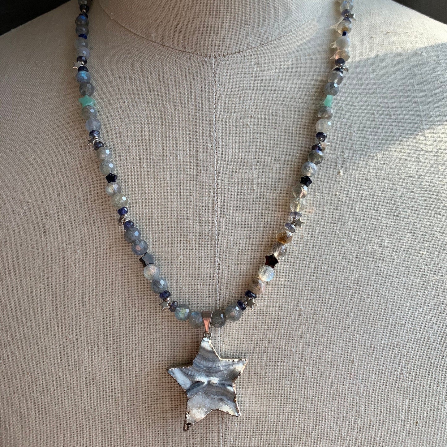The Stars are Shining - quartz druzy star strung with faceted labradorite rounds, iolite, sterling stars, various carved stone stars, sterling seed beads and findings.